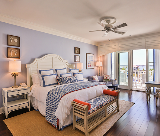 Our guest rooms and suites feature upscale furnishings with hand-painted elements complemented by a coastal palette that provides a tranquil environment you’ll never want to leave. Unwind on the stylish seating of your oversized patio or balcony, rest easy in our custom-made beds with luxurious bedding, and refresh in a deep soaking tub or shower with Gilchrist & Soames® bath amenities.